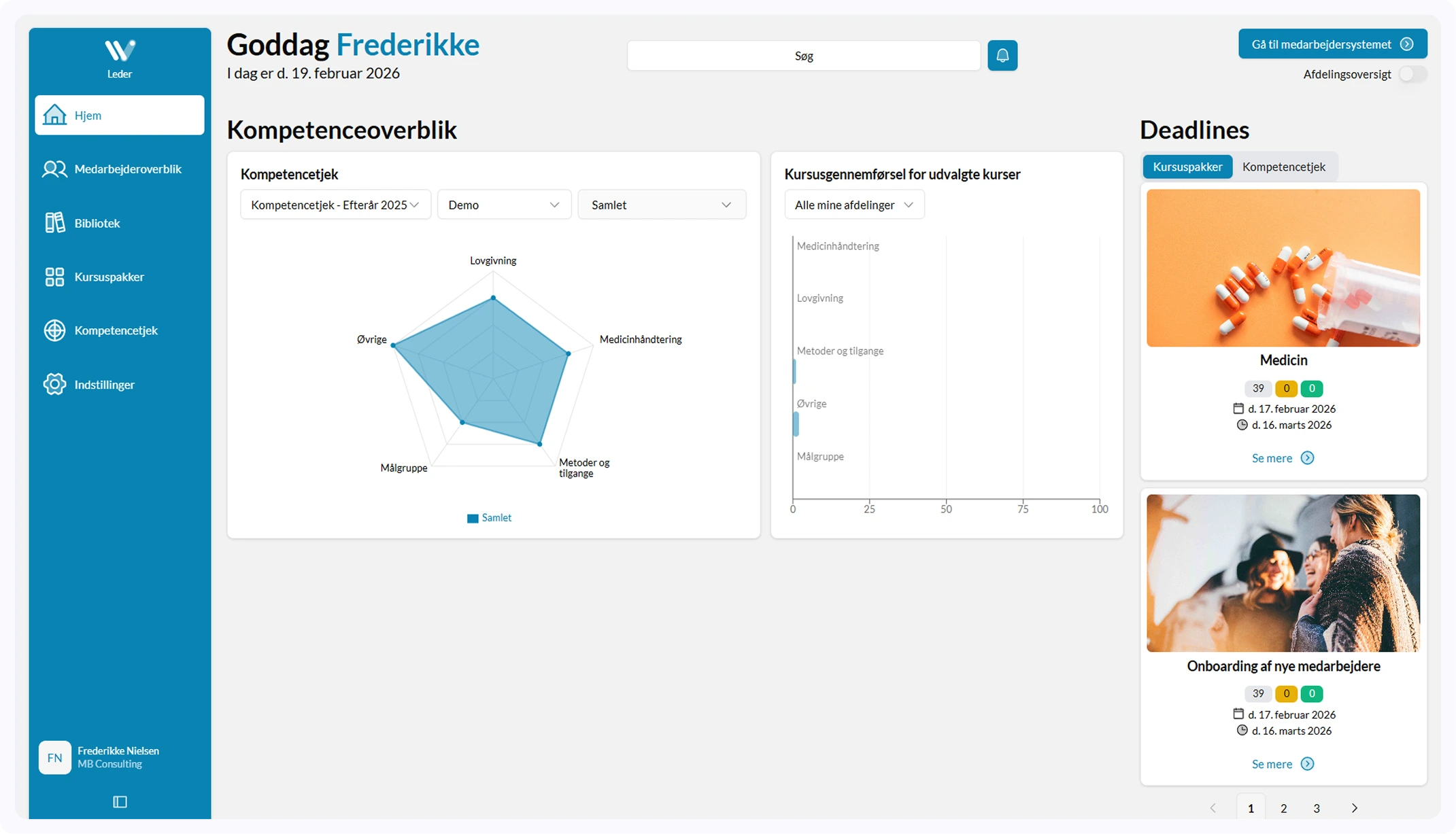 På baggrund af medarbejdernes gennemførte kurser og kompetencetjek genereres data, som giver ledelsen et indblik i eksisterende kompetencer og udviklingsmuligheder på både medarbejder- og afdelingsniveau. Dette giver en unik mulighed for at sætte ind netop dér, hvor behovet er størst. Ud fra disse data er der ligeledes mulighed for at generere rapporter, der kan bruges som dokumentation ved tilsyn.