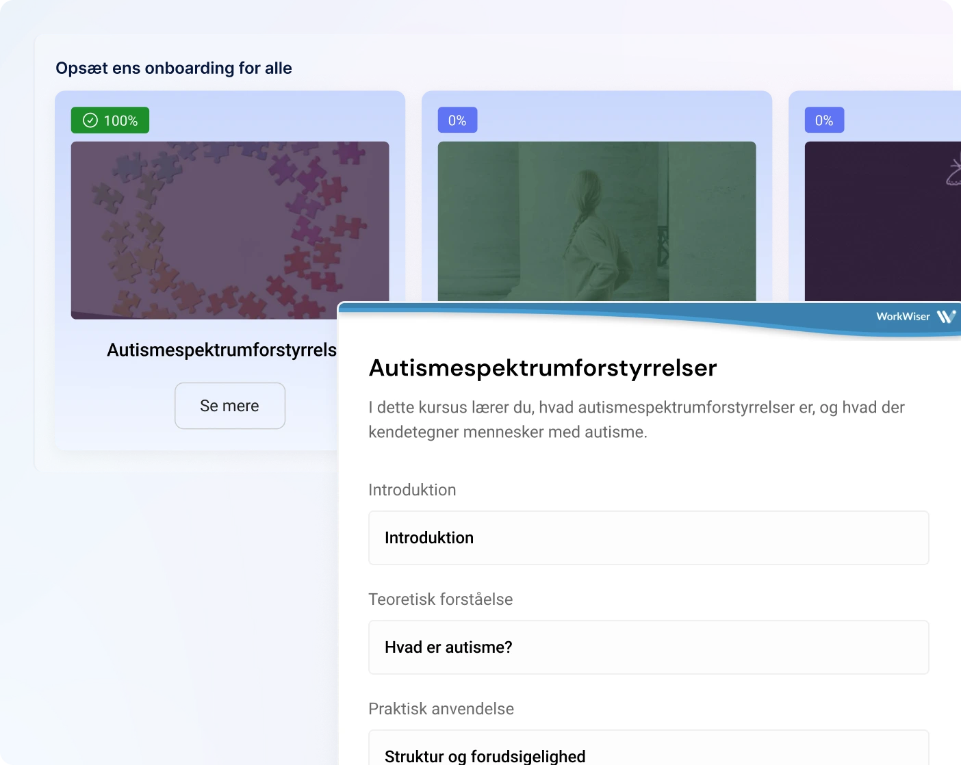 I Workwiser kan du oprette onboardingforløb med kurser, introduktionsmaterialer og interne dokumenter på platformen. Nye medarbejdere kan følge forløbet i deres tempo, mens ledere har overblik over, hvem der har gennemført hvilke dele.